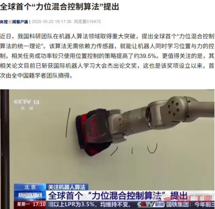 我國(guó)科研團(tuán)隊(duì)提出全球首個(gè)“力位混合控制算法”,機(jī)器人操作成功率提升近 40%