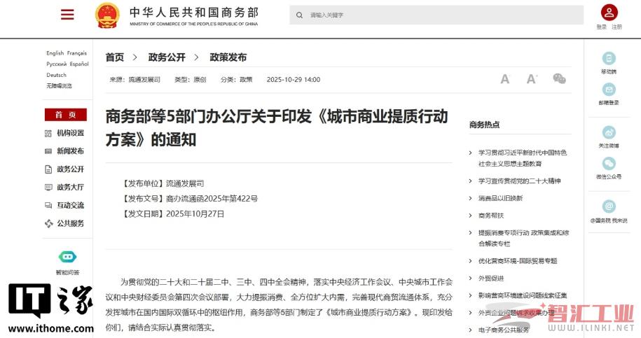 10月29日消息,商務部等 5 部門辦公廳發(fā)布關于印發(fā)《城市商業(yè)提質行動方案》的通知。